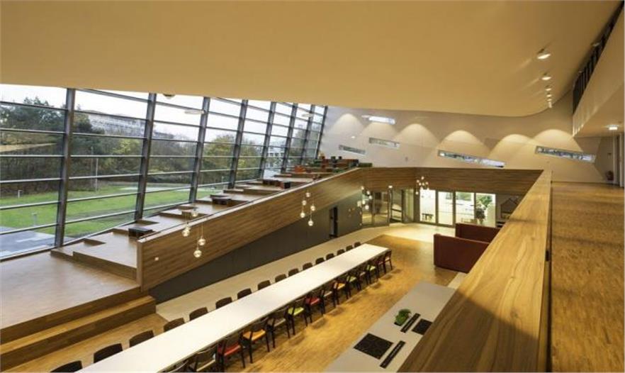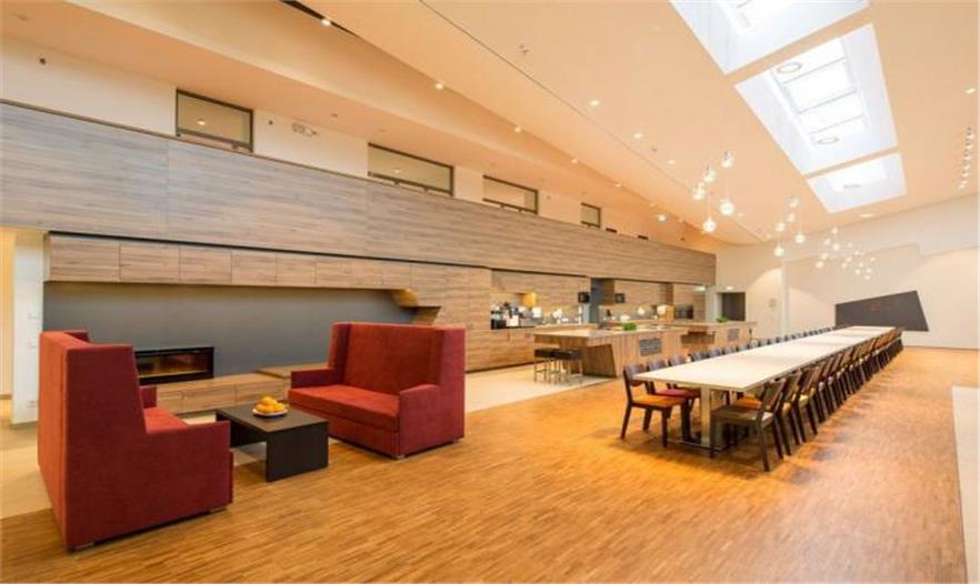 樓上有 25 間朝西的房間,配有雙人床和工作的桌面,可以住進(jìn)一個家庭并在這里安靜地工作。房間里都有橫條型的窗戶,能看到遠(yuǎn)處的田野風(fēng)光。