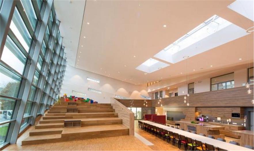 環(huán)繞在公共區(qū)域四周是一個通向二樓的很寬的緩坡,緊挨著落地玻璃,可以側(cè)臥著看書或者躺下來休息。如果有小孩過來,這里也是一個表演的地方。
