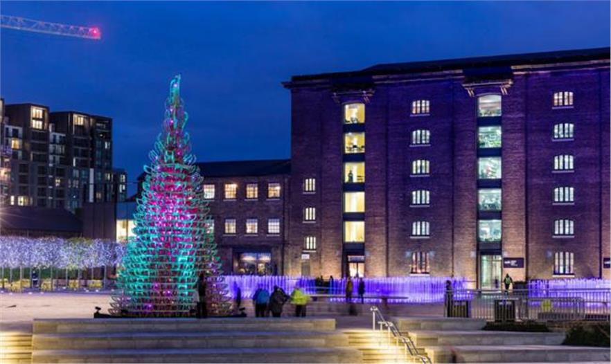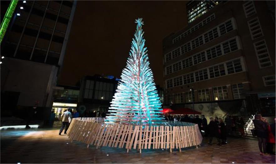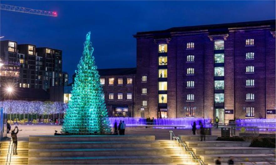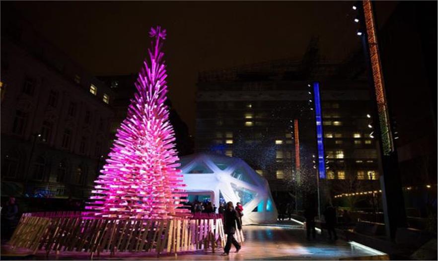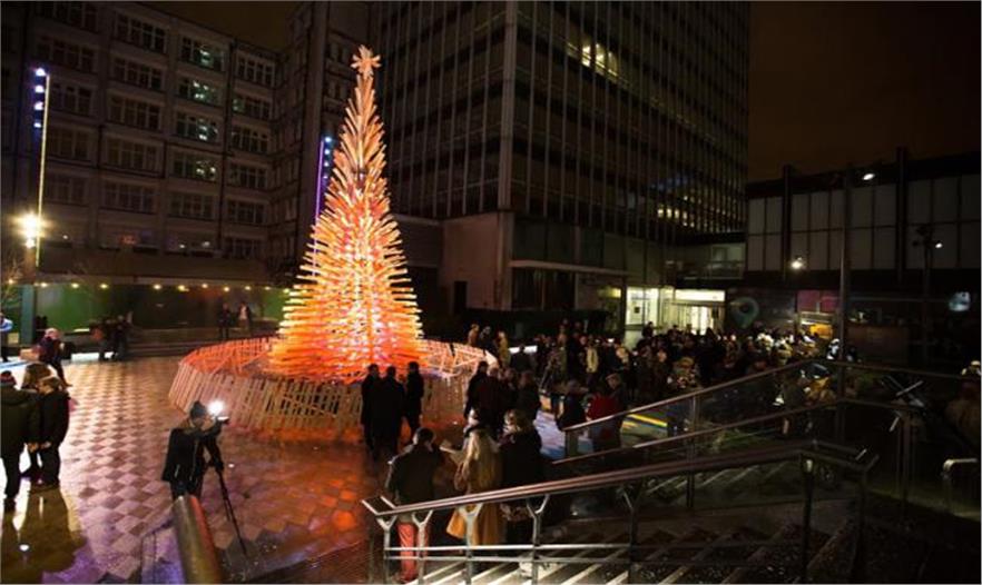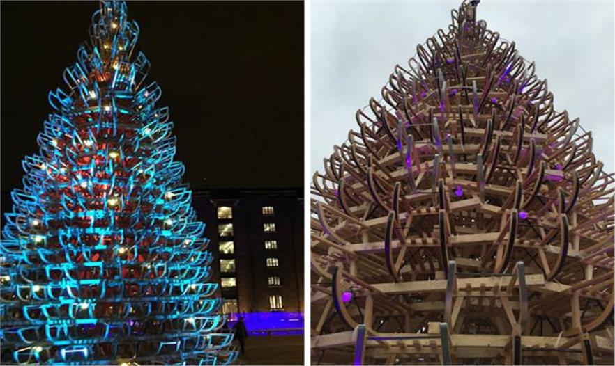 在倫敦國王十字區(qū)谷倉廣場(Granary Square)上,Hello Wood社團與倫敦的視覺藝術組織Creatmosphere合作建造了一棵圣誕樹,由365個發(fā)光的木質雪橇建造而成,代表一整年的時間。這棵樹突出強調氣候變化的影響,多年以來已經禁止在圣誕節(jié)期間在倫敦山上滑雪橇。