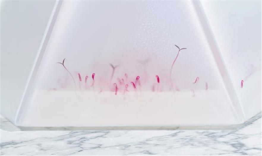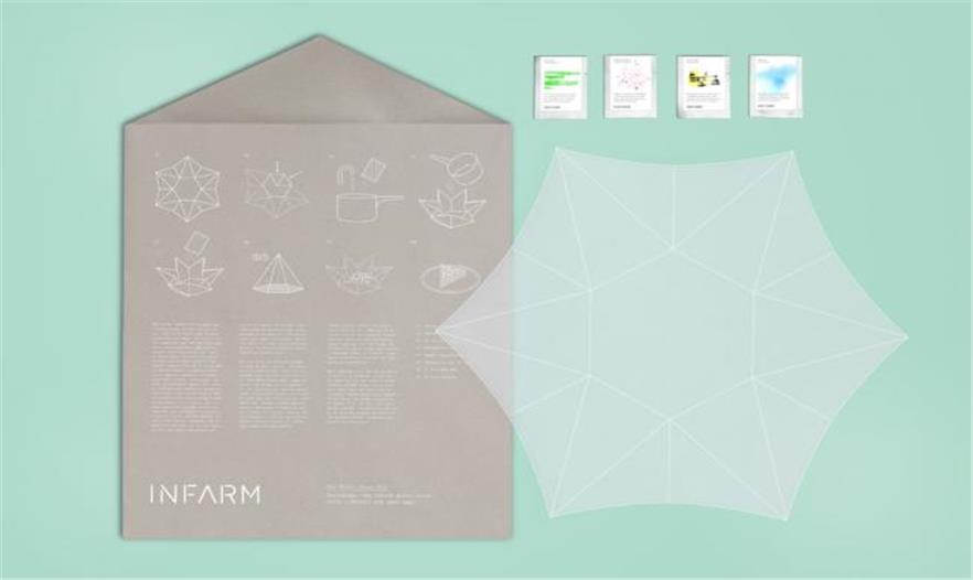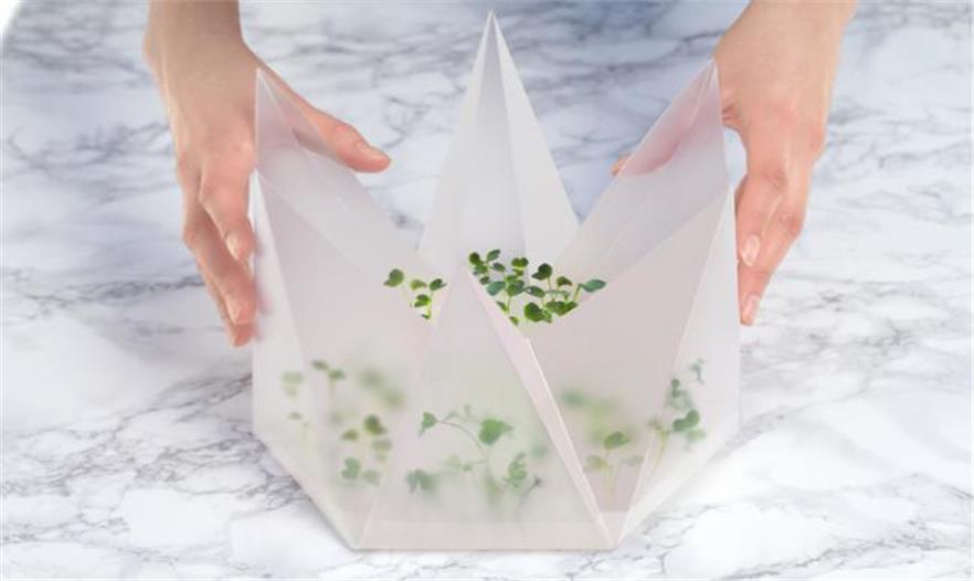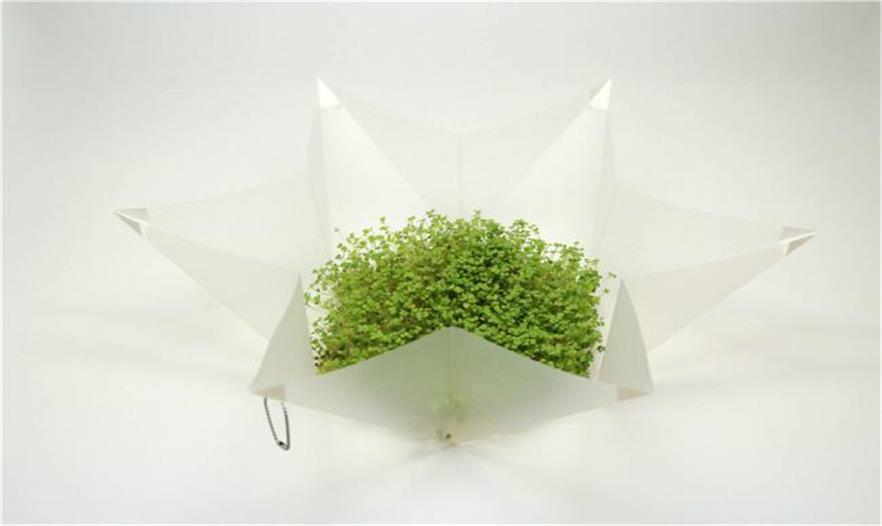 微型花園工具包是一個平板包裝,它包括三部分:可折疊的溫室、有機種子和瓊脂粉。受到古老折紙藝術(shù)的啟發(fā),微型花園可以折疊成一個微型溫室。它由可重復利用和可再生的透明塑料制成,因此你可以看到植物的整個生長過程。使用透明海藻基瓊脂凝膠作為種子的生長介質(zhì),微型花園能夠自給自足。只要一到兩周的時間,這些小小的菜就可以吃了,甚至一次水都不用澆,而且它像韭菜那樣,割了一茬還會再長出一茬。