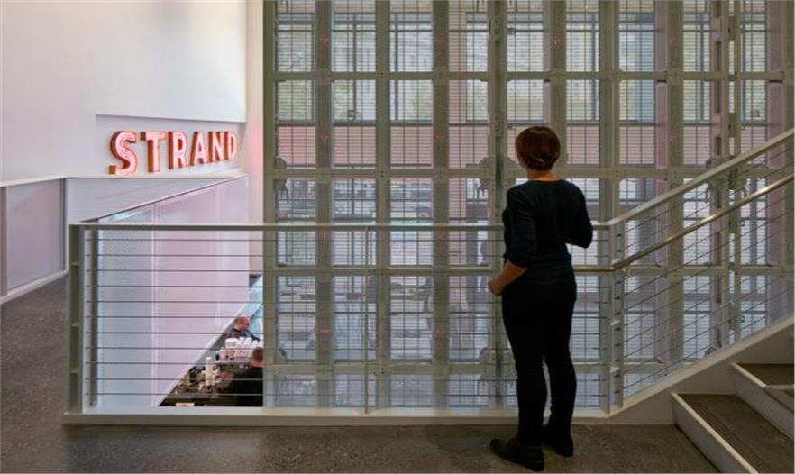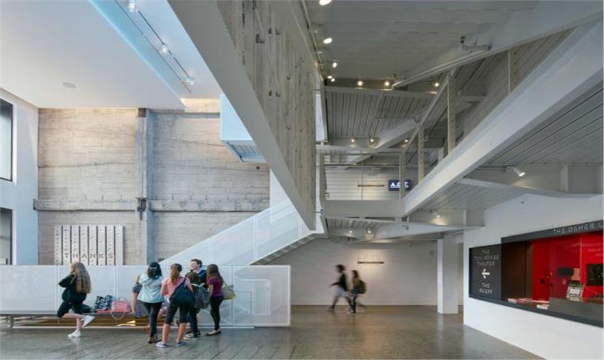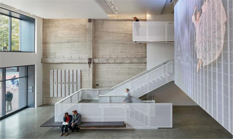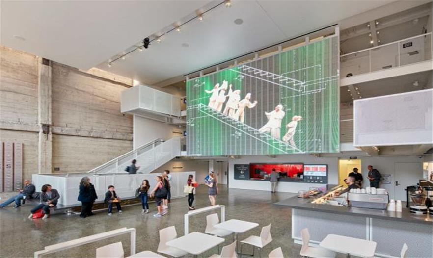 三層高的大廳內(nèi)懸臂式的露臺(tái)與穿孔金屬板支撐的交叉式樓梯構(gòu)成了員工與游客的主要活動(dòng)路徑,亦將室內(nèi)的活動(dòng)景象完全暴露于街道。一個(gè)大型的 LED 顯示屏不斷播放著各種藝術(shù)影像。