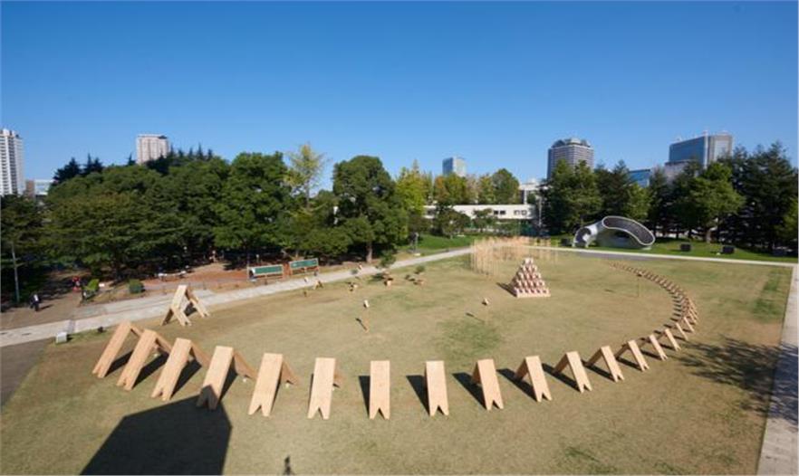 2015年?yáng)|京設(shè)計(jì)周期間,隈研吾采用相同的概念來(lái)設(shè)計(jì)Tsumiki展館——搭建在東京市中心公園的臨時(shí)結(jié)構(gòu)。除了金字塔形的裝置,還有獨(dú)立組件按照尺寸從大到小順序排成的半圓。Tsumiki的模塊是由日本的雪松制成,并且采用森林管理委員會(huì)認(rèn)證的木材生產(chǎn)加工。