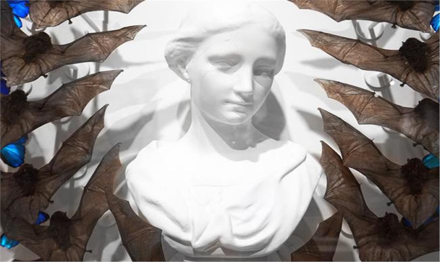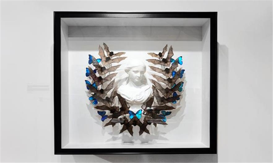 運(yùn)用許多不同的材料和藝術(shù)手法來表現(xiàn)自然之美和主觀恐懼,這是joseph grazi一直在探索的主題,最近他創(chuàng)作了作品“nightwatch(守夜)”繼續(xù)這一話題的探索。該作品在scope miami beach的joseph gross gallery畫廊展覽,它為我們呈現(xiàn)了一個(gè)經(jīng)典的女性石膏半身像,周圍被一圈動(dòng)物元素包圍著,包括一打蝙蝠標(biāo)本和11只藍(lán)色蝴蝶,它們在雕像周圍形成了一個(gè)馬蹄形結(jié)構(gòu)。