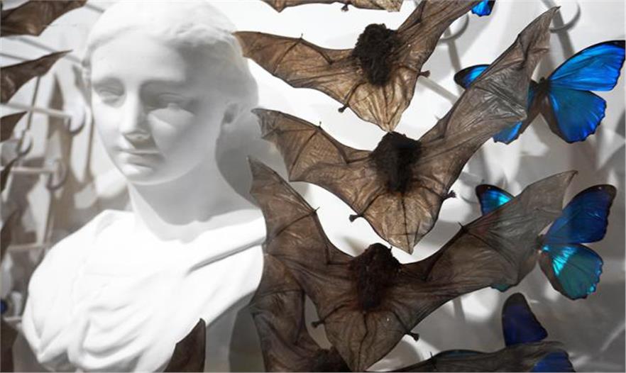 蝙蝠標(biāo)本和11只藍(lán)色蝴蝶構(gòu)成了一個(gè)馬蹄形結(jié)構(gòu)