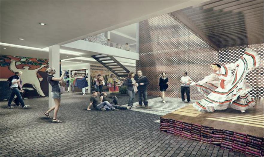 該座廣場的設(shè)計(jì)目的在于在一個(gè)吸引人的環(huán)境中提升本國的手工藝品文化及市場,所以在建筑外側(cè)有著大量的壁畫,作為對于游人和顧客的引導(dǎo)和空間過渡。