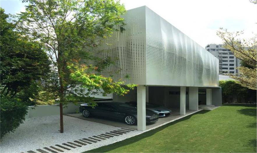 作為當(dāng)代藝術(shù)與設(shè)計(jì)的收藏家,業(yè)主也希望將高度可視化的入口結(jié)構(gòu)充當(dāng)其藝術(shù)收藏品的延伸部分,同時(shí)融合入現(xiàn)有的街道和景觀。OOZN參考了包圍內(nèi)部空間柔軟的臥室窗簾,將之置換成為平滑的鋁制表皮作為外立面。穿孔的平滑表皮可以將光線傳遞至內(nèi)部,穿孔的密度按照現(xiàn)有窗口的布局。