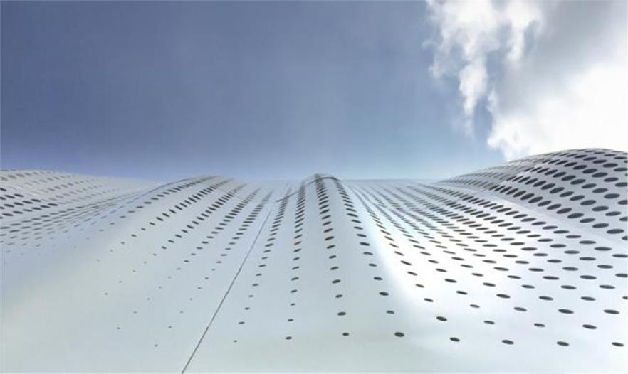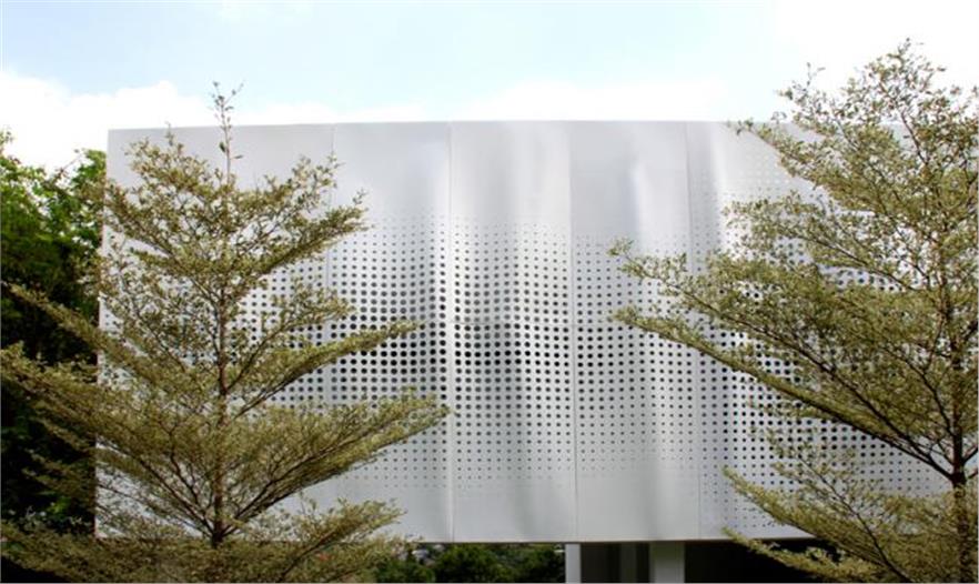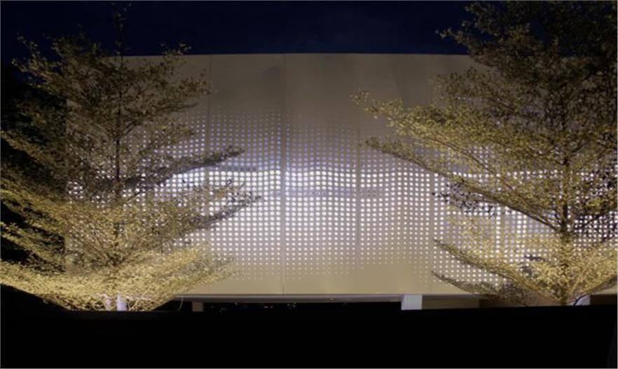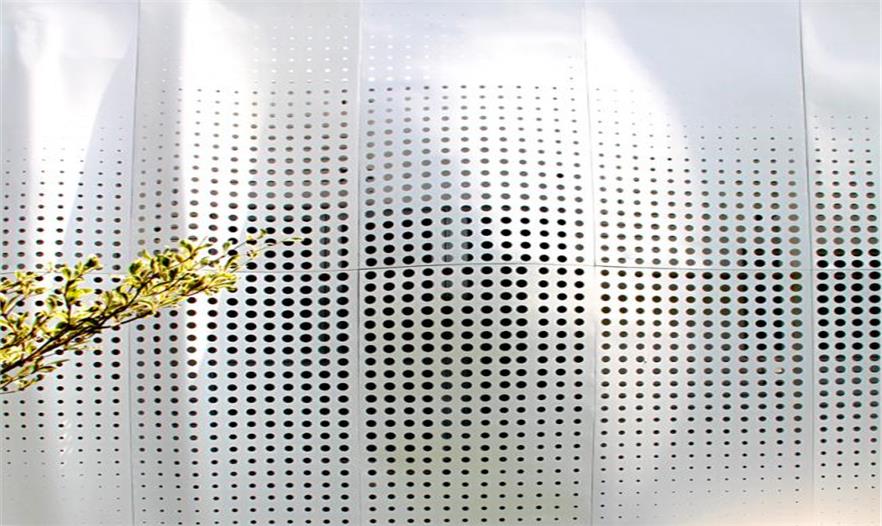 設(shè)計(jì)中采用金屬材料通常更多代表堅(jiān)硬和冰冷,該設(shè)計(jì)中則如輕柔的織物般包裹。該入口體塊位于草坪之上,一排樹進(jìn)一步將之從街道視角上隱藏起來。材料、形式、反射性和景觀結(jié)合在一起,創(chuàng)造出結(jié)構(gòu)懸浮在草坪之上的印象。在夜晚外部照明設(shè)計(jì)進(jìn)一步增強(qiáng)了這種效果。該金屬板在一個(gè)專業(yè)的廣州工廠中制造。首先基于建筑的3D模型制作手工粘土模具,再使用氣動(dòng)壓力機(jī)制作2.5mm鋁板。然后在運(yùn)至場(chǎng)地安裝之前,進(jìn)行打孔并做啞光粉末處理。