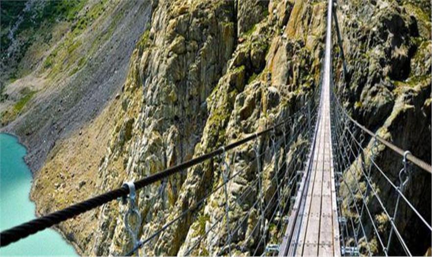 在所有懸索橋中,最令人驚心動(dòng)魄的應(yīng)該就是特里夫特懸索橋了。該橋長(zhǎng)170米,跨伯爾尼高地的特里夫特斯湖,湖面與橋之間無(wú)任何連接,湖光山色冰川美景盡收眼底,每年吸引著成千上萬(wàn)名渡橋者前來(lái)游覽。