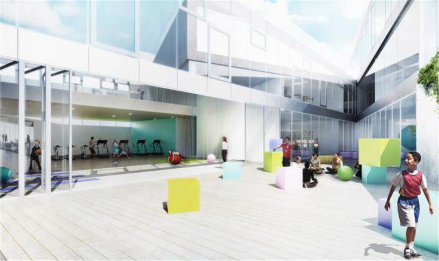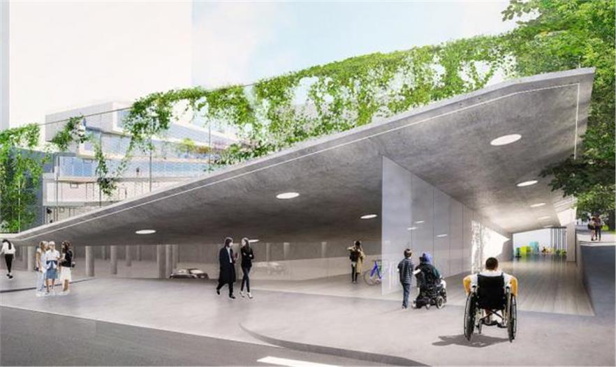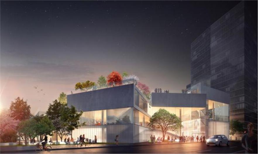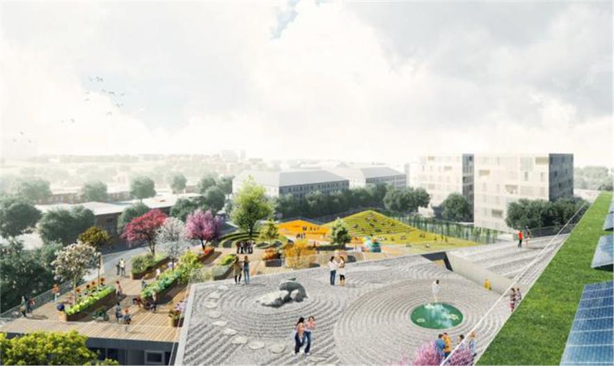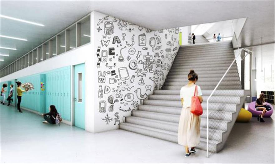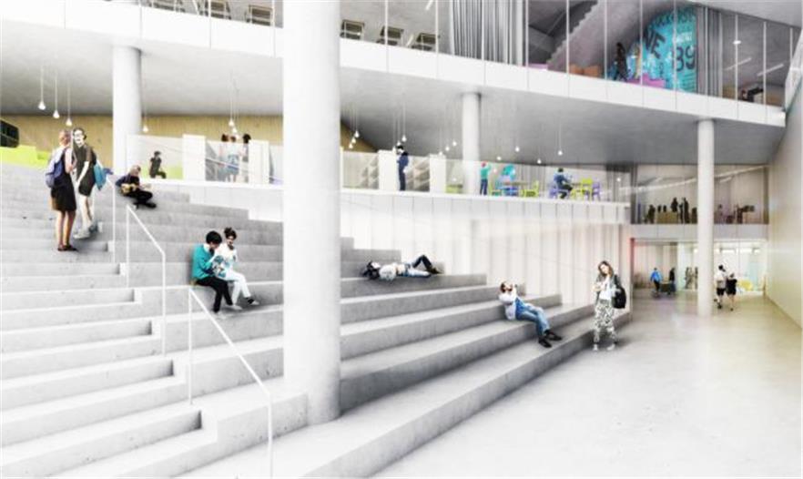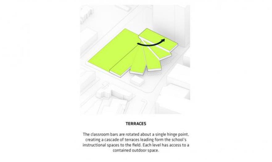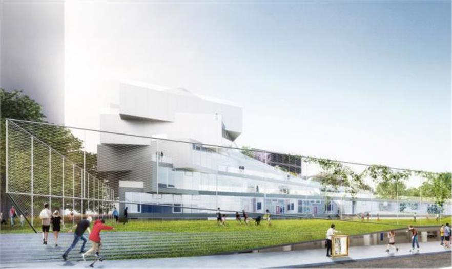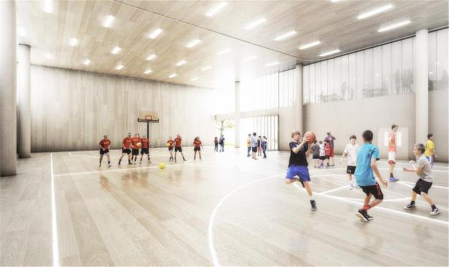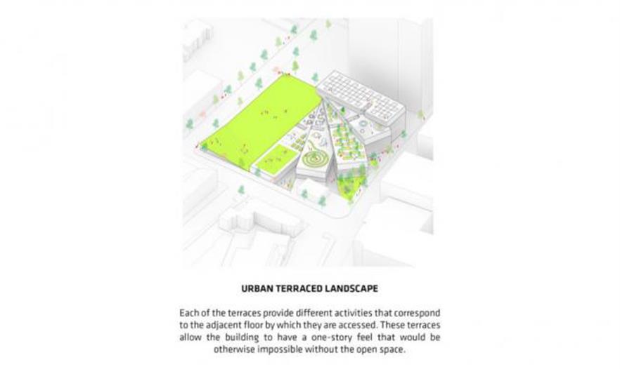 學(xué)生可以從室內(nèi)教室進(jìn)入到所有的屋頂露臺,進(jìn)行各種不同的活動。學(xué)校報告廳、體育館和市民空間被分散在“梯田塊”的下面;通過一條通道從這些空間到達(dá)對面的體育場。這個體育場會被降低,一角下沉,另一角抬高建造出一個有遮蓬的入口通道。