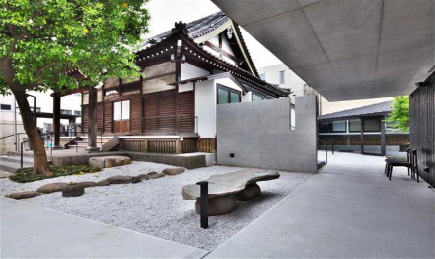 建筑師 Hirota 選擇了清水混凝土與燒焦的雪松木兩種材質(zhì),用于加建建筑外立面的裝飾。與新建筑形成對(duì)比的是老建筑棕色調(diào)的木頭外立面與白色渲染過(guò)的鄉(xiāng)村屋頂瓦。設(shè)計(jì)團(tuán)隊(duì)試圖用這種方式,區(qū)別新老建筑的年代感。而空間外一個(gè)矩形混凝土框架則是寺廟的入口。