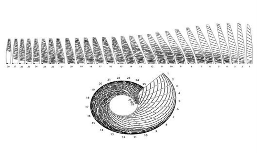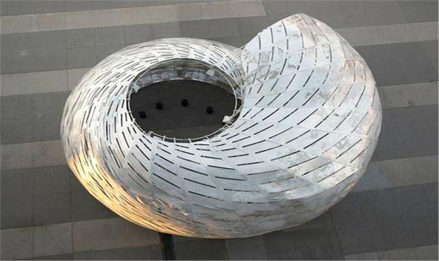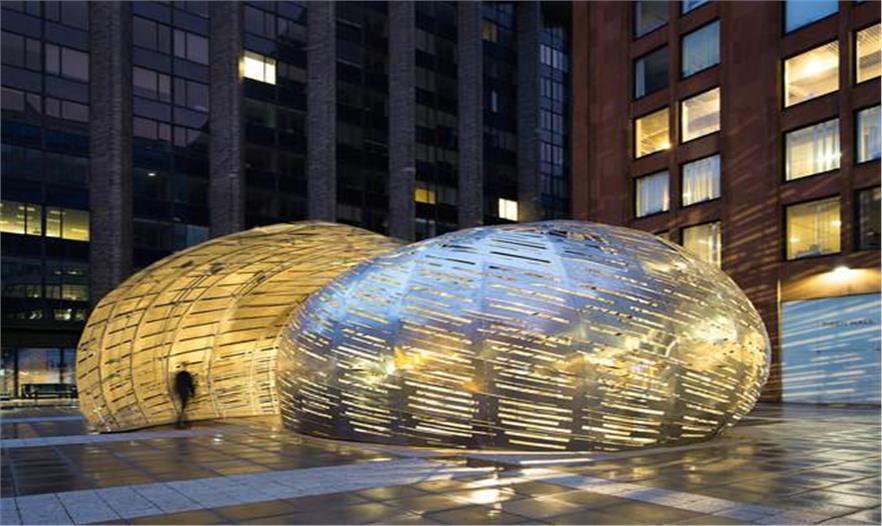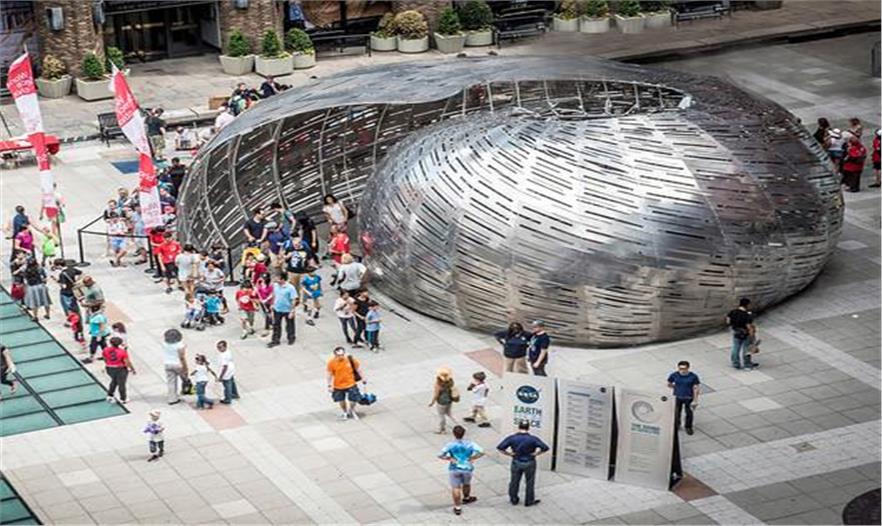 這座可移動(dòng)的鸚鵡螺形狀展館中的空間根據(jù)19顆環(huán)繞地球的衛(wèi)星軌道設(shè)計(jì)完成。表面覆蓋了3500平方英尺的水刀切割鋁板,展廳可以說(shuō)是將超過(guò)100個(gè)衛(wèi)星軌道融合在了一起,組成了這一曲線的鋁制展館。