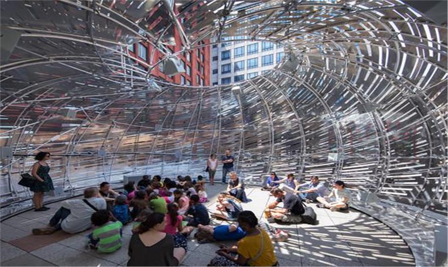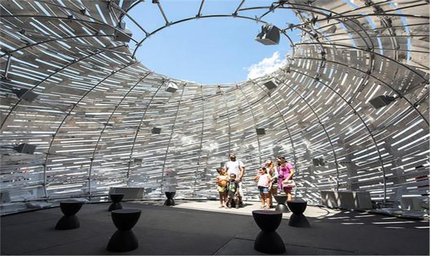 這座30英尺直徑的展館中可以進(jìn)行演講,以及播放藝術(shù)家、作曲家 Shane Myrbeck 制作并轉(zhuǎn)譯的外太空衛(wèi)星實(shí)時(shí)錄音。