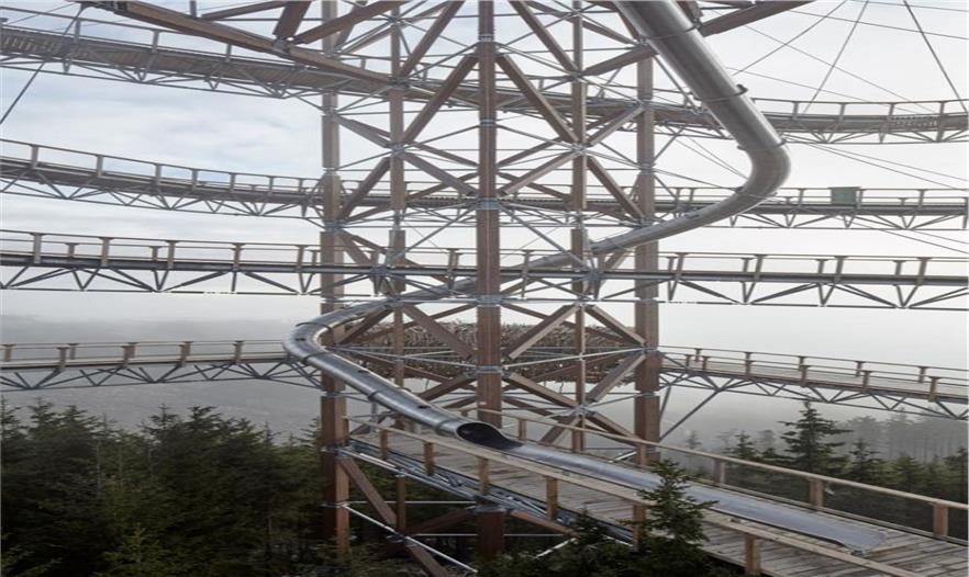 這座天空步道與以玻璃為主要材料的中國(guó)湖南好漢橋和美國(guó)芝加哥的西爾斯大廈不同。它采用網(wǎng)眼狀地板供那些不怕高的勇敢游客們登上頂端,感受刺激。除了這處“勇敢者走廊”,這條步道還建有一條長(zhǎng)330英尺(約100米)的金屬滑道,約有18層樓那樣高,那飛揚(yáng)的流線型,飛流直下,直到地面。