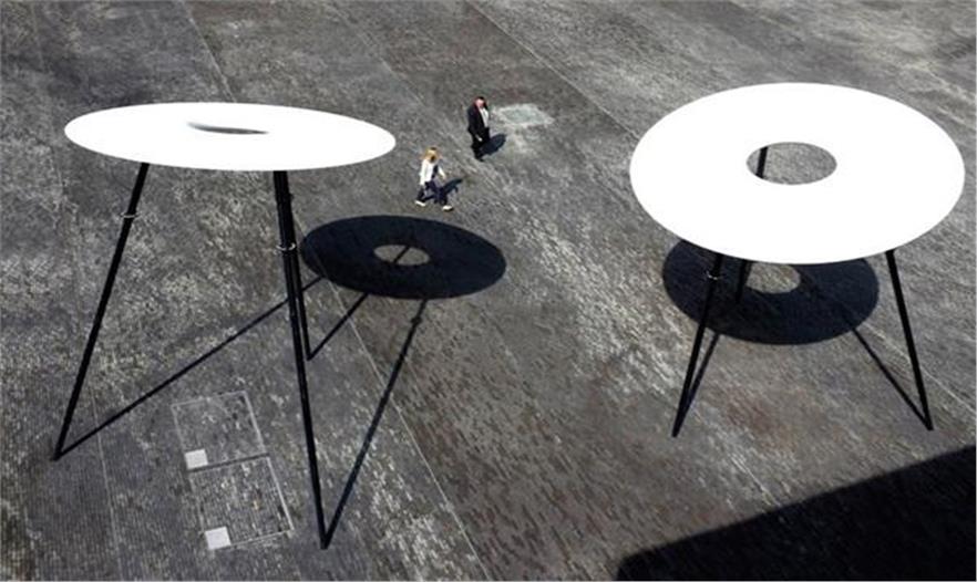 Guddevol 街燈為圓盤形狀,類似于不明飛行物(UFO)。它由五個大圓燈組成,整個圓燈直徑約為 420cm,中心處留有一個開口。曲線開口處鑲嵌有 LED 燈,一圈燈光向上照亮圓盤表面,形成了白色圓環(huán)。圓燈由三根細(xì)架作為支撐,與地面都保持一定的傾角,充滿意境美。