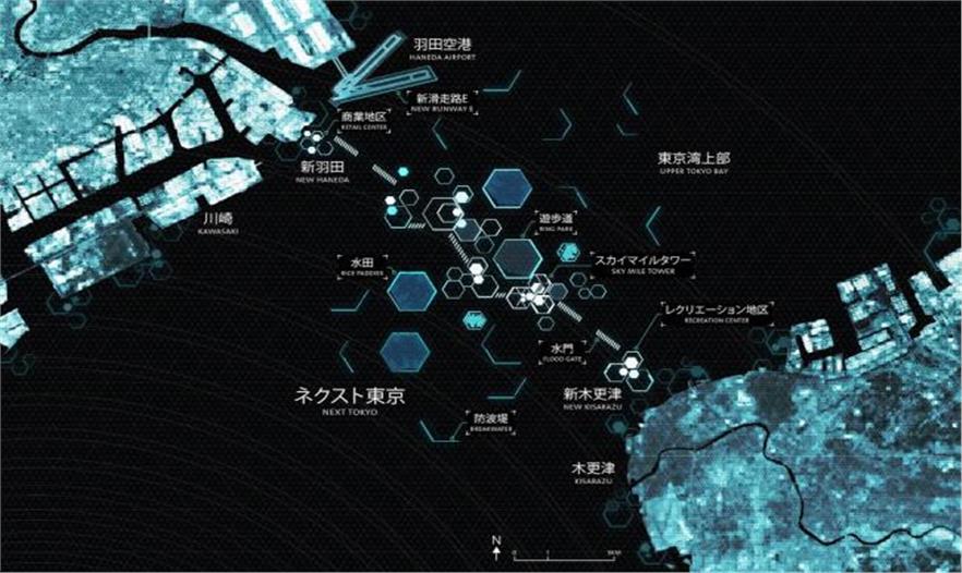 “未來東京”提供了一個跨越整個海灣地區(qū)的基礎(chǔ)設(shè)施網(wǎng)絡(luò),成為了東京灣海岸線的緩沖地帶。這些小島聚落被用作高密度發(fā)展的基礎(chǔ),其中居住了50萬希望逃離海岸危險并減少通勤時間的居民。