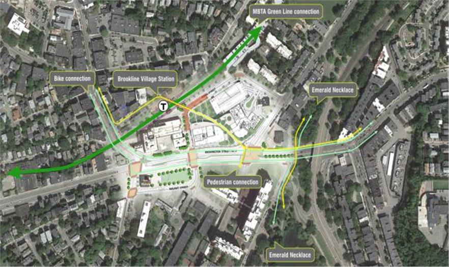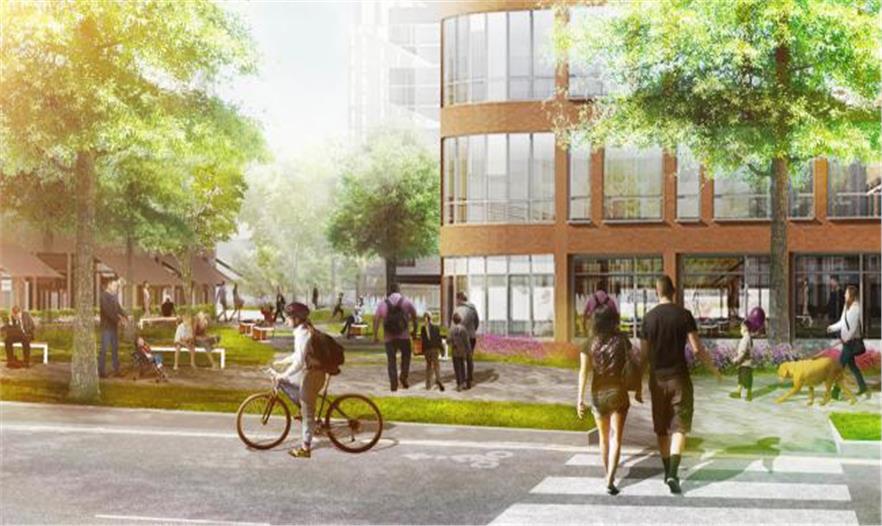主要目標包括將公共交通與城市廣場結合起來,在整個發(fā)展區(qū)建造自行車道。該主體規(guī)劃方案包含一系列的公共聚集空間;城市廣場將Brookline Village T 站與社區(qū)公園結合起來,為社區(qū)建造出受歡迎的以家庭為主的環(huán)境。