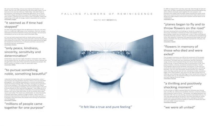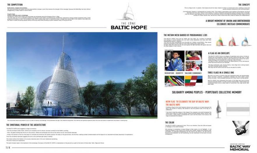 該方案表達(dá)了波羅的海之路示威游行活動(dòng)中675公里的人鏈所代表的力量。它用了一塊大理石來(lái)比喻這次675公里長(zhǎng)的抗議活動(dòng)。而在一個(gè)紅色立方體的中間設(shè)置了各種方式的紀(jì)念功能。