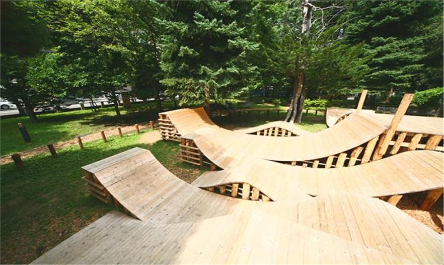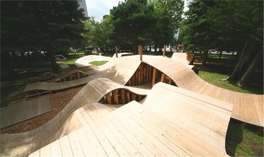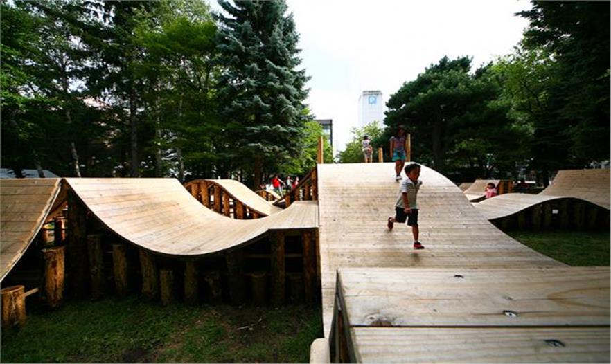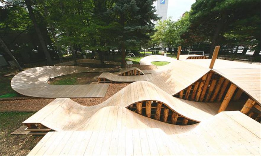 位于日本北海道波浪起伏的木結(jié)構(gòu)被構(gòu)想為是一處模擬森林。為了設(shè)計該臨時工程,給孩子們打造沉浸式的玩樂空間,建筑師五十嵐淳(Jun Igarashi)與YCAM interlab、山口媒體藝術(shù)中心的研究人員和開發(fā)人員小組通力合作。該項目位于札幌大通公園的樹林中,使用了產(chǎn)自當(dāng)?shù)氐哪静?,打造了一系列相連的坡道、小路和高地。