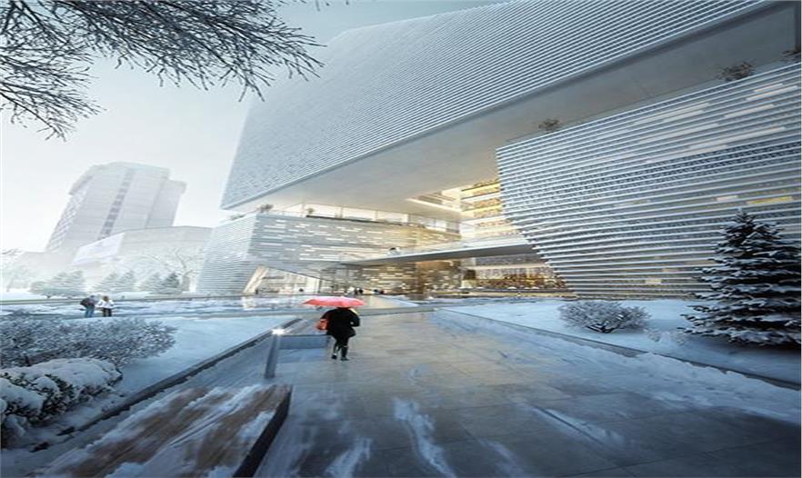 建筑的其他部分被白色的金屬百葉包裹,看似隨機的分布具有遮擋不同方向陽光的作用。