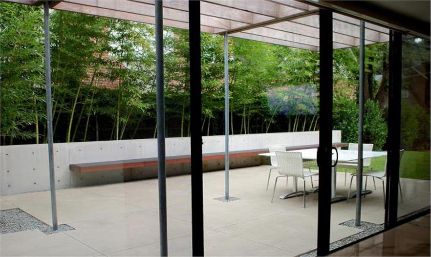 這個小型的現(xiàn)代花園滿足了該區(qū)域要求隱私和可用的戶外空間的簡單需求。這個現(xiàn)代化房屋位于一個已建、分布緊密的20世紀20年代街區(qū)內(nèi)。該花園位于2個多層傳統(tǒng)房屋之間,將居民的室內(nèi)外使用功能隔離開,不會產(chǎn)生侵入感。為了達到這一目標,Hocker Design Group事務所在該空間的一邊種植高大的竹子,并在竹子前面建造了一面混凝土墻,設置懸臂式的ipé 木長凳,可供人們休息。朝向房屋的街道一邊通過種植本土草本植物和地被植物將景色轉(zhuǎn)變成自然景觀。這個過渡景觀替換了社區(qū)標準和靜態(tài)的前庭草坪。