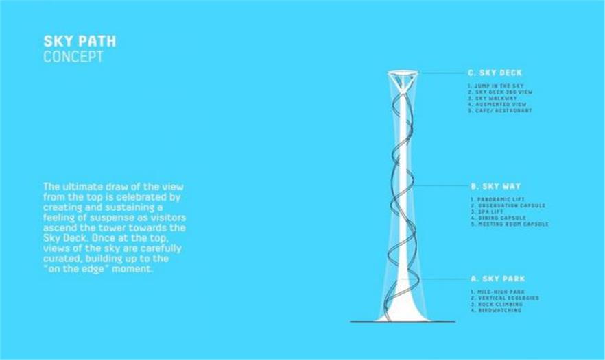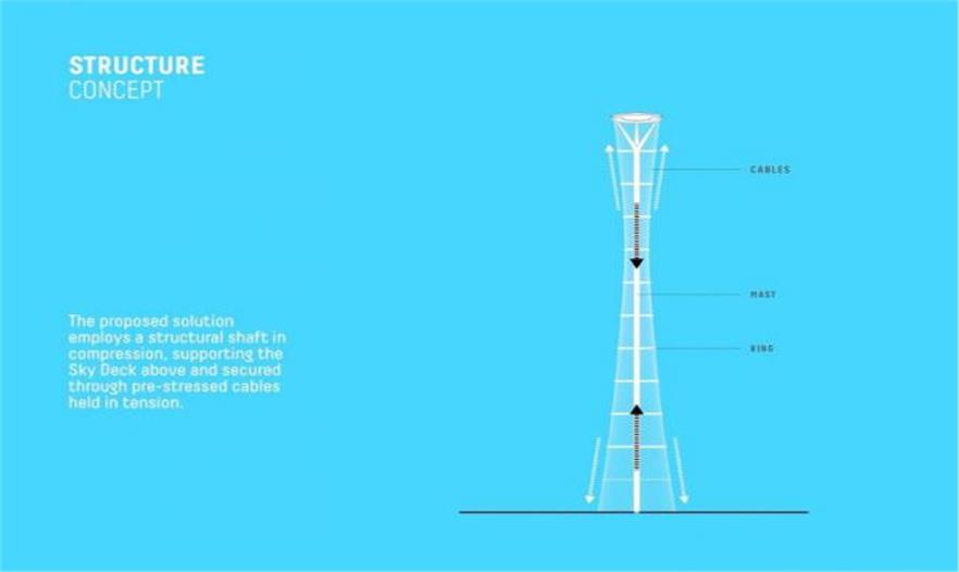 建造之后,游客可以通過20米直徑塔樓周邊環(huán)繞的一系列“雕塑膠囊”向上爬升,在將參觀者輸送到最高處平臺、“空中走廊”、公園和餐廳到同時,這些膠囊中可以進行一系列活動,包括聚會喝音樂會,成為一個私人場地。