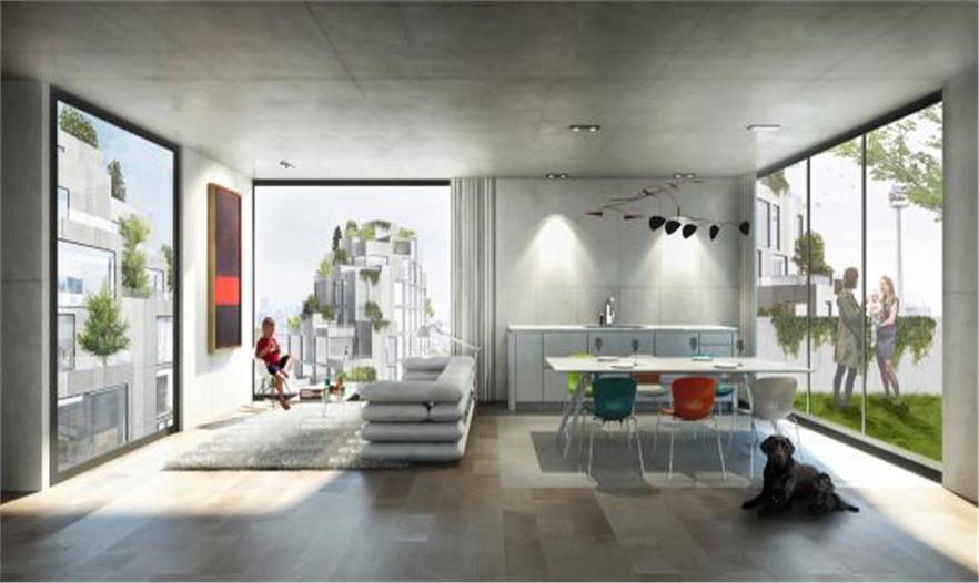 建筑有5個15到17層的尖頂,瀑布般的設(shè)計由堆疊的12乘12英尺(約3.6米*3.6米)的單元模塊構(gòu)成,整體使用了超過500個單元。居民由建筑中的中央庭院和街道鏈接乘了公共和私密交織的網(wǎng)絡(luò)。