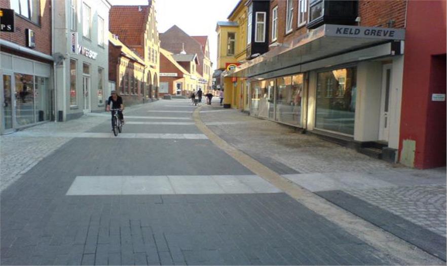 Adelgade到Norregade的聯(lián)系得到加強(qiáng)。黑色花崗巖類型的玄武巖長條路蜿蜒穿行于整個(gè)城市,同時(shí)白色花崗巖“橋梁”將商店入口與這條路帶結(jié)合起來。
