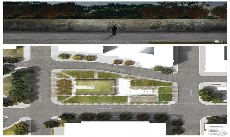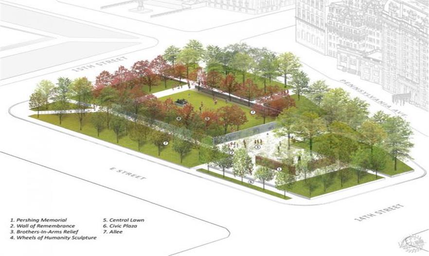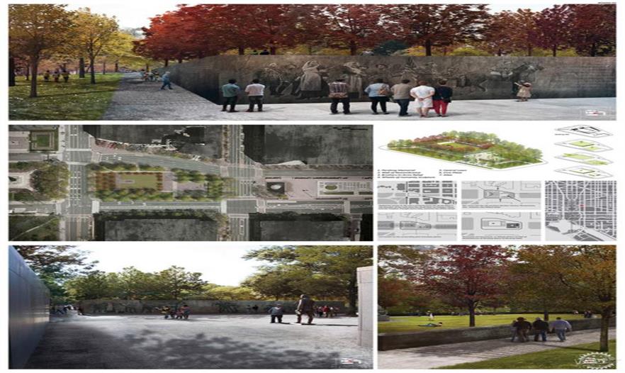 JW:兩者都有。我必須說現(xiàn)有的潘興公園存在著很深遠(yuǎn)的影響。上周我一直試圖向人們傳達(dá)潘興公園實際上是一個很好的公園,如果你像我參加這個競賽一樣深入得了解這個公園,你會發(fā)現(xiàn)有些原來的設(shè)計真的很好,那些東西不應(yīng)該就此失去。特別是現(xiàn)有的潘興紀(jì)念像。在公園北邊的長凳區(qū),有著能看到賓夕法尼亞大道到國會大廈風(fēng)景的最好視角。所以對我來說這些是非常重要的,不能擺脫這些東西。我知道有所保留會扮演的重要作用,以及人們會怎么看待這個公園。所以,從很早的時候,我盡可能多得保留這些元素,而不是完全推翻。