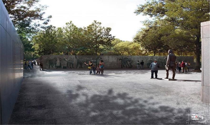 JW: 這包括幾個方面。我們設(shè)計的青銅浮雕墻,結(jié)合了戰(zhàn)爭時期的文本與圖像。南北面的墻壁上充斥著戰(zhàn)前的語錄、戰(zhàn)爭期間士兵們的日記和筆記以及戰(zhàn)爭之后的復(fù)蘇。公園東面墻上的浮雕圖像也是如此。它們都記述了美國從一個與世隔絕的國家,通過不斷強(qiáng)化,最后屹立于世界之林的轉(zhuǎn)變。但是,這個故事是通過人們的經(jīng)驗和這些人的人文表達(dá)來體現(xiàn)的。這在很大程度上印證了紀(jì)念一戰(zhàn)的主題。