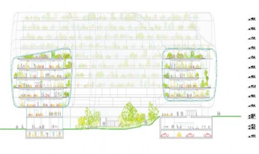 這棟建筑不僅為1800名員工提供了工作環(huán)境,還為公務員、政治家和公眾探討城市未來發(fā)展提供了一個民主會議空間。該設計方案試圖為這里的大尺度建筑開創(chuàng)先河,在建筑的中心創(chuàng)造了一個自然公園,營造了怡人的環(huán)境。綠意縈繞著建筑的外立面,植物在四氟乙烯膜(ETFE)的建筑表皮下生長,成為節(jié)能和通風系統(tǒng)的一部分。綠色植物營造了一種積極的工作環(huán)境,同時還可以凈化空氣。