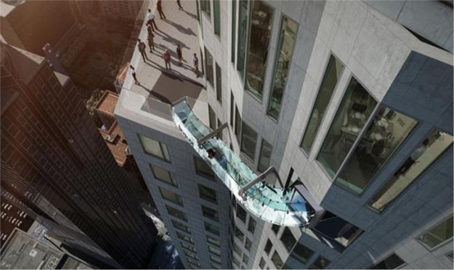 那些有勇氣嘗試這座滑梯的人將滑過45米長的凹槽,凹槽由4英寸(約10厘米)厚的玻璃構成,位于建筑69和70層之間的觀景平臺上。
