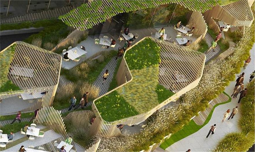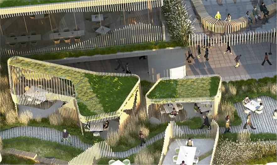 這個項目有 1500 平方米,靈感源于 19 世紀(jì)的具有浪漫色彩的花園,共有兩層。樓上的露臺與廣場是一個平面,上面搭建一種木質(zhì)的亭子 kiosks,用高低不一的垂直木頭搭建出開發(fā)式的空間,具有流動的音樂性。亭子周圍種植以來自意大利帝沃利 (Tivoli) 的灌木植物,有一定的遮擋作用。陽光透過木條和植物照射下來,讓空間充滿了自然的暖意。人們可以隨意穿梭于其中,在陽光下或者亭子里吃飯、聊天,很愜意。