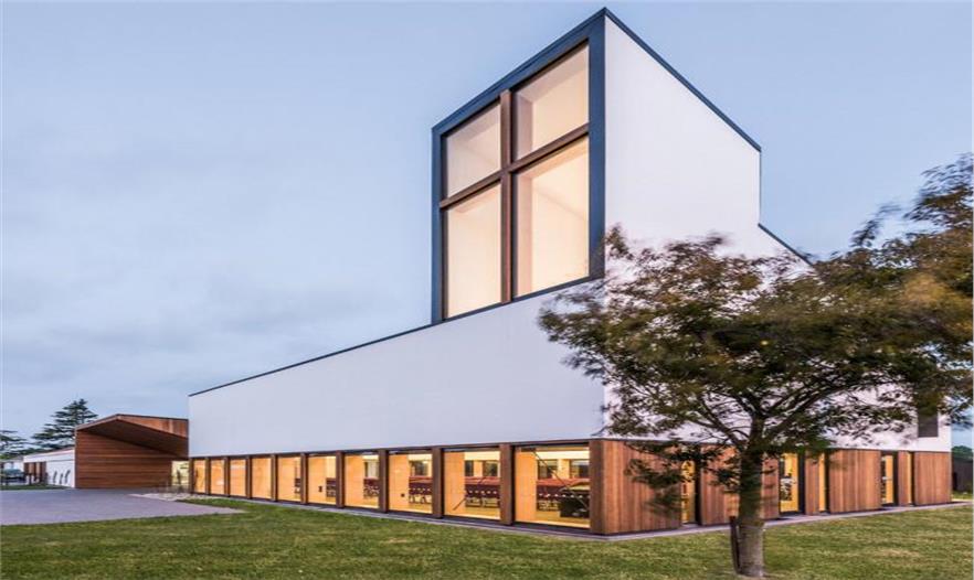 整體木制框架的結(jié)構(gòu)結(jié)合落地式的大窗戶面向周邊主要街道,保證了建筑的透明度與開放性,連接建筑與街道的戶外庭院,給教堂平添幾分宜人親近的元素。而在建筑的角落位置,一幢塔樓筑起,向一側(cè)成斜面屋頂,成為建筑制高點的同時,分外醒目。