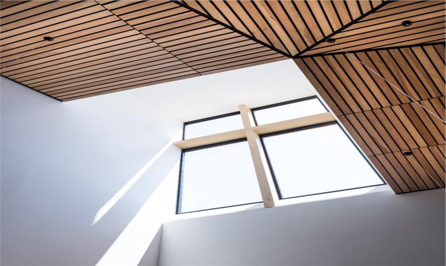 上部白色外立面部分干凈無裝飾,僅有一個大型木制十字架點明建筑的身份。塔樓的大窗戶承擔(dān)了部分天窗引入自然光線的功能,增強了冥想空間的氛圍,也算是強化了教堂這一主要功能。大量木材的運用則意在強調(diào)創(chuàng)造自然氣息,加強與周邊環(huán)境的聯(lián)系。