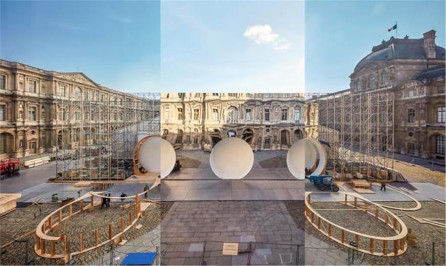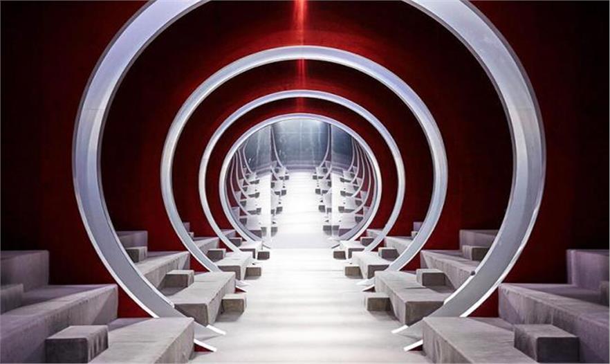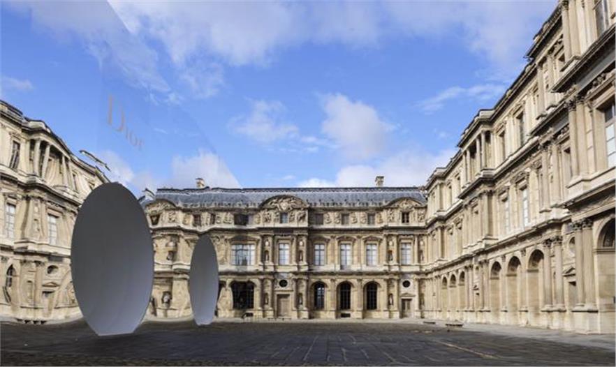 在今年巴黎時(shí)尚周期間,bureau betak設(shè)計(jì)出一面巨大的鏡面作品,放置在巴黎盧浮宮中央廣場(chǎng)。這款反射板可以映射出廣場(chǎng)四周歷史建筑的抽象圖案,形成一種沉浸式體驗(yàn)環(huán)境,供參觀者感受。參觀者通過一條寬大的隧道進(jìn)入動(dòng)感十足、燈光旖旎的秀場(chǎng)。走進(jìn)秀場(chǎng),一系列金屬圓拱門映入眼簾,這也是模特兒走秀的T形臺(tái);還有階梯狀坐臺(tái),便于觀眾欣賞時(shí)裝秀。