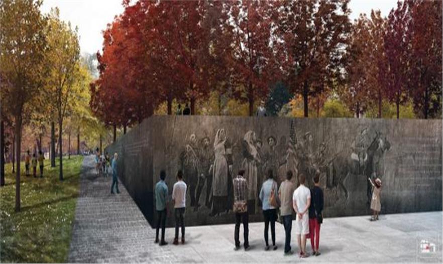 JW: 這包括幾個(gè)方面。我們?cè)O(shè)計(jì)的青銅浮雕墻,結(jié)合了戰(zhàn)爭(zhēng)時(shí)期的文本與圖像。南北面的墻壁上充斥著戰(zhàn)前的語錄、戰(zhàn)爭(zhēng)期間士兵們的日記和筆記以及戰(zhàn)爭(zhēng)之后的復(fù)蘇。公園東面墻上的浮雕圖像也是如此。它們都記述了美國(guó)從一個(gè)與世隔絕的國(guó)家,通過不斷強(qiáng)化,最后屹立于世界之林的轉(zhuǎn)變。但是,這個(gè)故事是通過人們的經(jīng)驗(yàn)和這些人的人文表達(dá)來體現(xiàn)的。這在很大程度上印證了紀(jì)念一戰(zhàn)的主題。