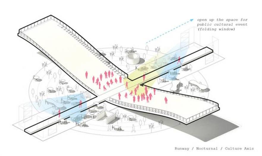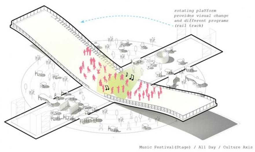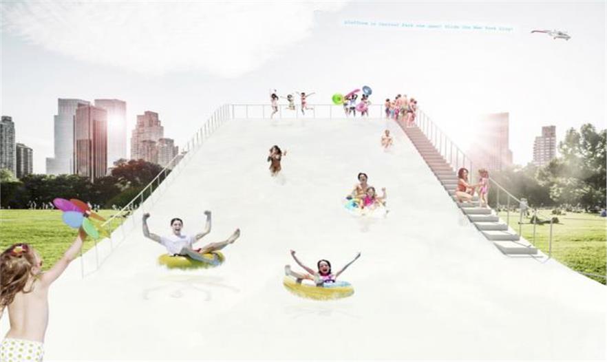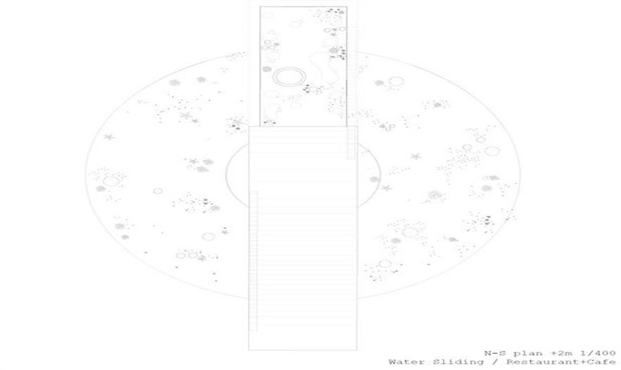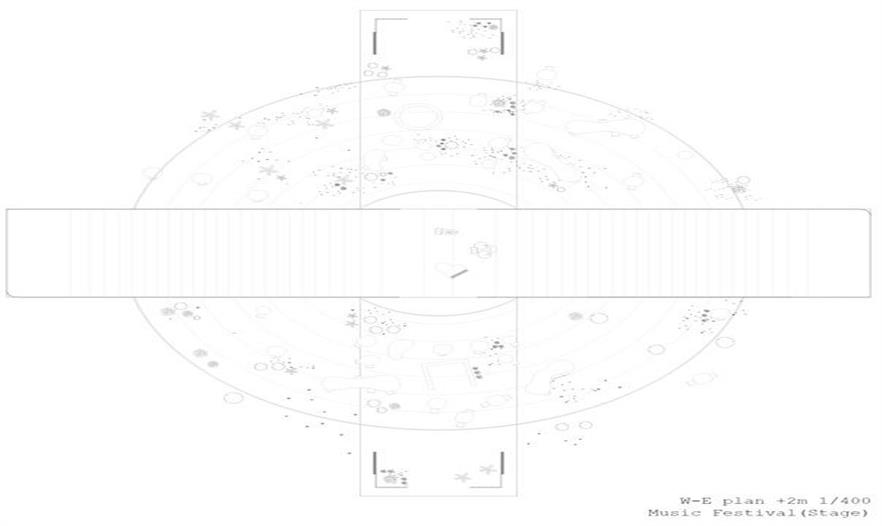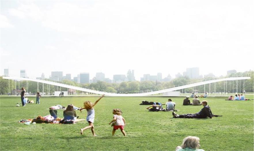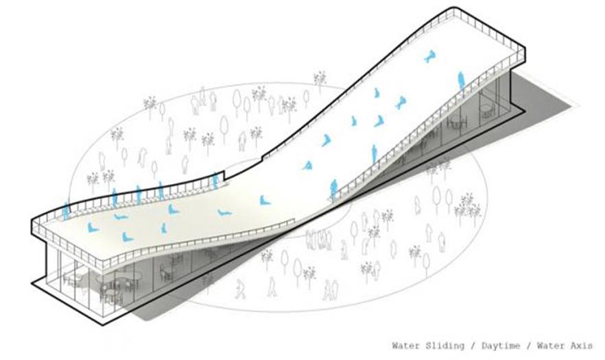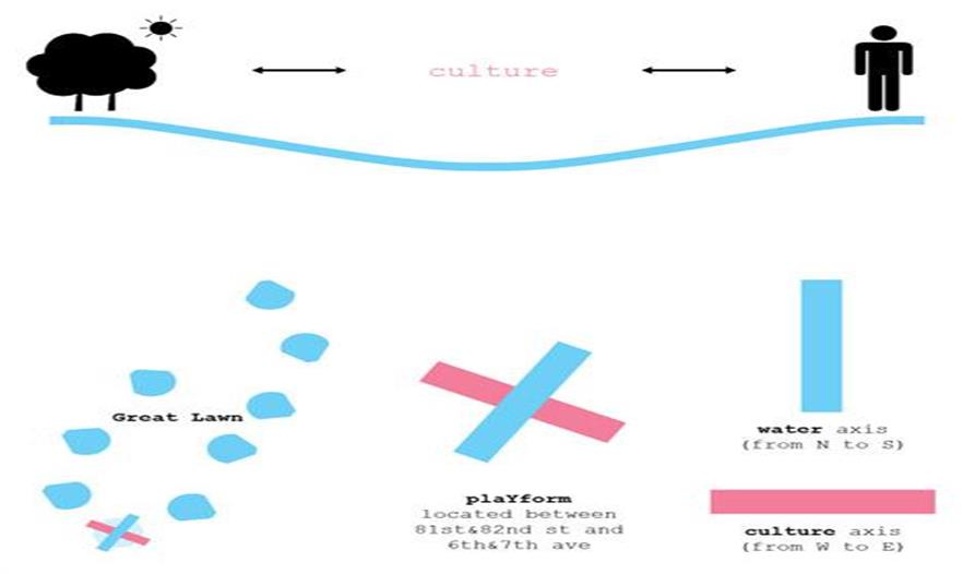 通過體塊簡單的推拉,建筑拉近了人與自然的關(guān)系,同時也打通了兩個城市肌理的視覺和空間上的聯(lián)系,南北向的水軸線與東西向的文化帶在此交匯。同時‘plaYform’可旋轉(zhuǎn)的頂棚為建筑帶來了更多的可能性。當(dāng)屋頂南北向延伸時,建筑連接延續(xù)著中央公園的水軸線。而當(dāng)建筑旋轉(zhuǎn)90度,成為了東西向時,則表示它將為居民們帶來各式各樣的文化休閑活動。旋轉(zhuǎn)不僅僅是建筑形體上的變化,也代表著其功能的變化。五花八門的夏季活動讓不同文化不同地區(qū)的人們愉快的共度夏季時光。比如,白天南北向的屋頂用作水滑梯,到了晚上,則搖身一變成為了東西向的T臺。紐約的人們在建筑前面大片的早地上嬉戲玩鬧。但只需要一個投影儀,這里立刻變成了露天電影院,人們?nèi)齼蓛傻淖诓莸厣希聪蚧頌槟徊嫉慕ㄖ⒚妗?/p>
