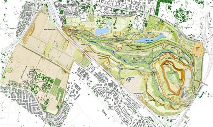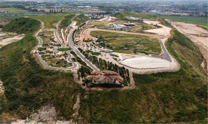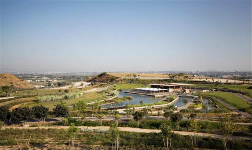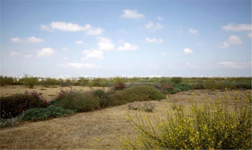 寬闊的臺(tái)地保留著陡峭山體的坡度,漸漸地轉(zhuǎn)變成綠色。由于坡度底部的河流污染被改造成平原,它隨著幾百萬立方米建筑碎石的增加而增高。這個(gè)臺(tái)地依然是光禿禿的;但是幾年之內(nèi),將以農(nóng)業(yè)類型種植大量樹木,用作多種功能,構(gòu)建一個(gè)山體。坡道和橋體將與平原相連,要挖掘出用于周期性洪水的滯留池:泛濫平原里的公園有較大型的樹木、分支河流以及道路;大型滯留系統(tǒng)中的一部分將保護(hù)特拉維夫市免遭洪水的破壞,同時(shí)發(fā)展成為一個(gè)國家性休閑景觀:Park Ariel Sharon。