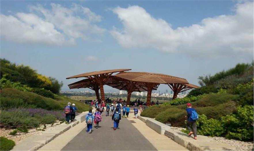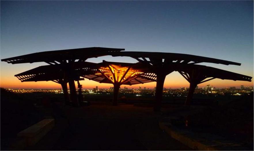 大風(fēng)橫掃高地的西部邊緣,在觀景臺(tái)上能觀賞到空中飛翔的獵鷹和烏鴉以及特拉維夫市天際線景象。楔形斜道以及有人造樹遮蔭的平臺(tái)遮蔽了西利亞填埋場(chǎng)的“壯觀”景象。這里明顯地涼爽些且安靜,能直接觀賞到天際線。只有當(dāng)轉(zhuǎn)移到有雕刻痕跡和遠(yuǎn)塔名字的欄桿時(shí),許多游客、學(xué)生和旅游團(tuán)才能感覺到熱風(fēng)。