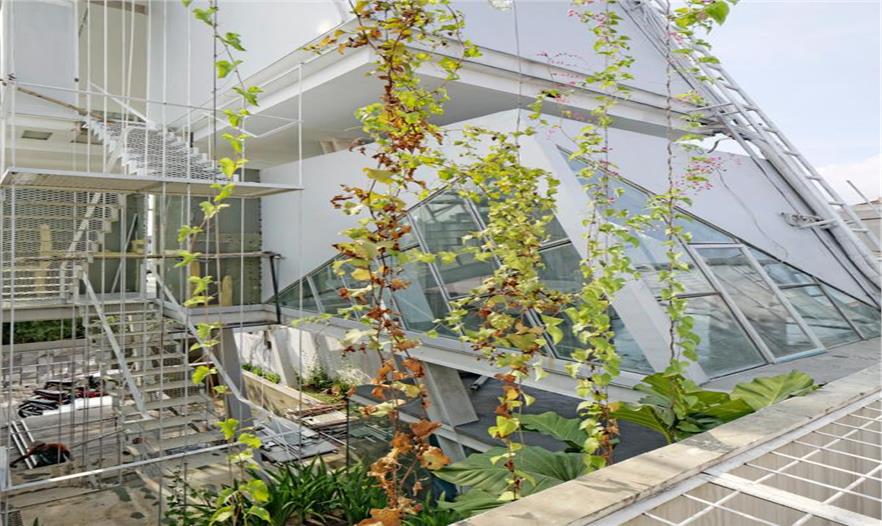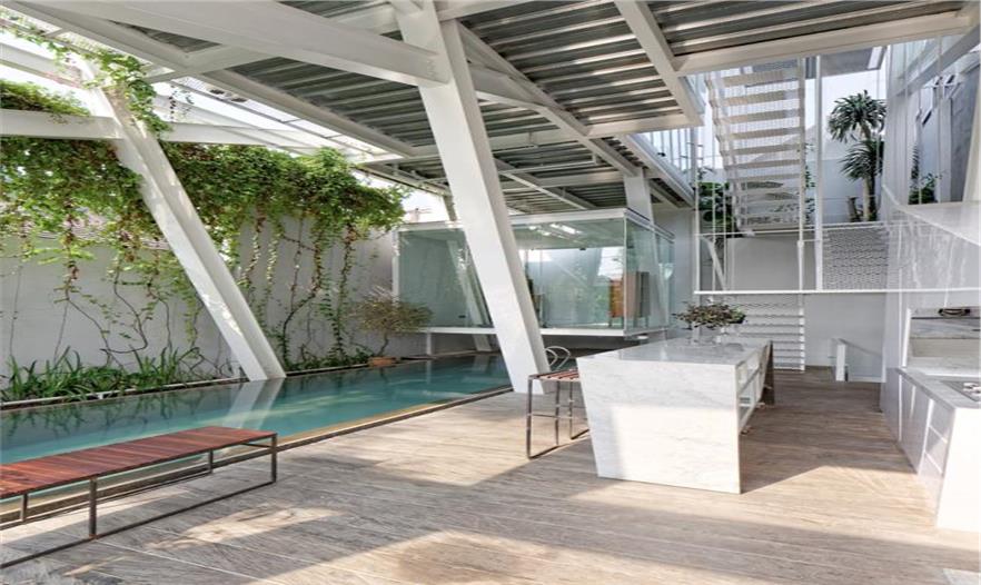 方案由貫穿三層空間的白色金屬網(wǎng)懸浮樓梯連接起來。為了柔化結(jié)構(gòu)的枯燥與棱角,設(shè)計(jì)師采用了室內(nèi)植物和樹木來營造熱帶屬性,同時(shí)也在室內(nèi)和室外之間提供了巧妙的過渡。