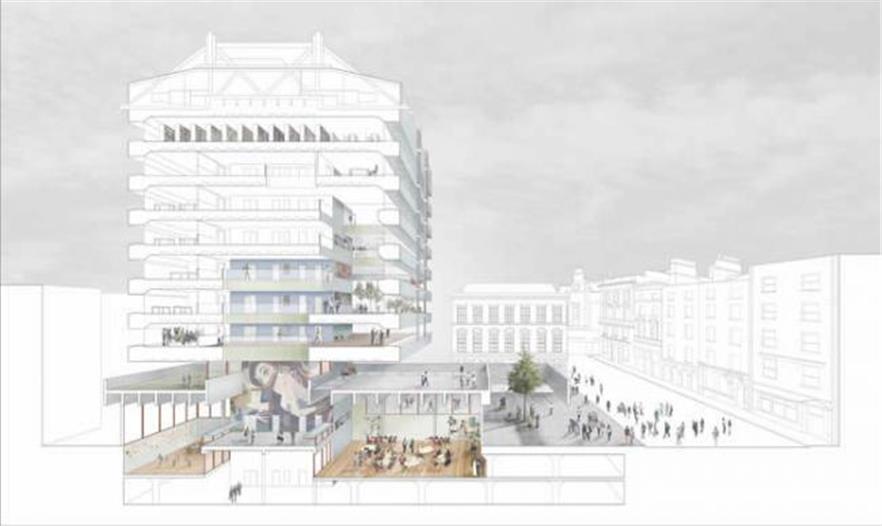中央銀行區(qū)提供了建造新型學(xué)校的機會,為開放的社會建造一所新中學(xué)。設(shè)計師移除現(xiàn)有的階梯和入口,在城市地表上挖出大空洞,能看到下面的地基。新屋頂橫跨該區(qū)域,為該學(xué)校主要的公共空間建造一個光線充足的遮蓬,在街道水平上設(shè)有一個寬闊的入口。這些空間允許市民進入,提供與居民共享的設(shè)施。教室和教學(xué)空間都在現(xiàn)有建筑的上層。其改變就在這些花園和空洞上,建造出與城市生活相聯(lián)系的空間。