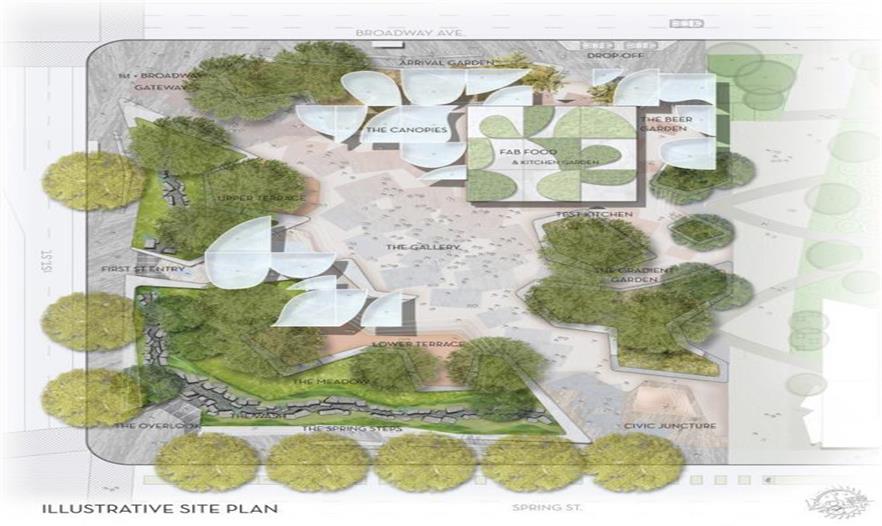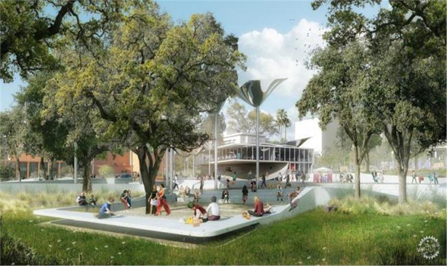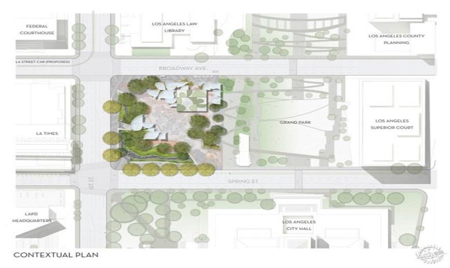 該公園中心廣場(chǎng)的設(shè)計(jì)方案通過(guò)提出布置多個(gè)能夠?yàn)槊癖娞峁?shù)蔭、光照以及反射公園內(nèi)部景觀于雕塑本身的樹(shù)冠型雕塑,創(chuàng)造出形象且具有趣味性的廣場(chǎng)空間。整體景觀設(shè)計(jì)則結(jié)合了種植成熟的無(wú)花果樹(shù)和橡木來(lái)模仿南加州本身的自然環(huán)境。在第一大街(FAB)的角落建立了一個(gè)新的連接關(guān)系——在視覺(jué)上和身體體驗(yàn)上——從第一大街文化走廊市政廳前的大臺(tái)階開(kāi)始,大量低矮的墻被設(shè)計(jì)成為可供人們休憩的非正式的座位,遠(yuǎn)看則像波浪起伏的絲帶。所有被雕塑覆蓋的陰影區(qū)域則被定義為一系列的“公園房”,用來(lái)進(jìn)行親密的聚會(huì)或者藝術(shù)與文化的空間交流活動(dòng),擁有大容量的露天圓形劇場(chǎng)座位與餐廳結(jié)合起來(lái),同時(shí)也可用于觀看主廣場(chǎng)上的表演。