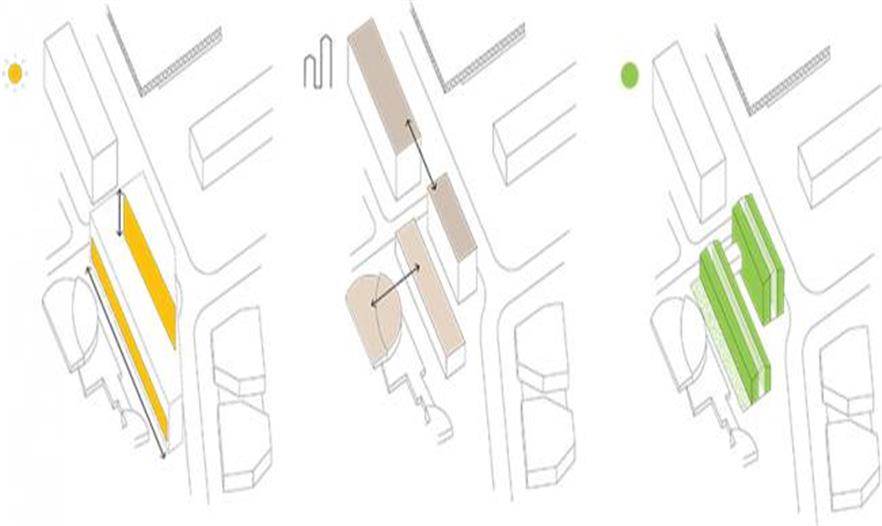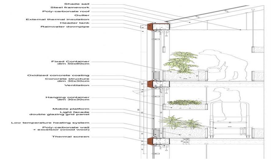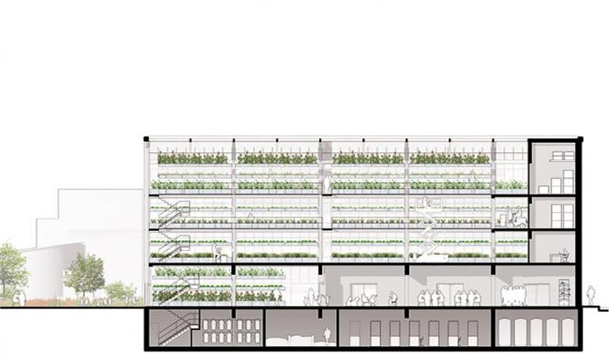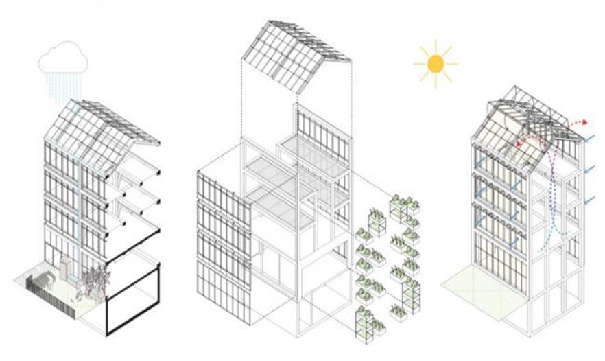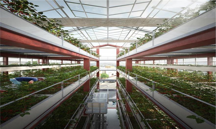 垂直農(nóng)場的設(shè)計旨在創(chuàng)造適宜種植農(nóng)作物的空間并為這些植物提供最大化的陽光照射。建筑中間的井口不僅促進(jìn)了光散布,還提高了建筑的熱交換能力。與此同時,方便了都市園丁轉(zhuǎn)運材料的需求。該方案希望在傳統(tǒng)商品蔬菜栽培和技術(shù)創(chuàng)新之間搭建一個動態(tài)的接合點,為向當(dāng)?shù)鼐用裉峁┬迈r食物提供一個機(jī)會,并努力重建城市與鄉(xiāng)村,天空與地面的聯(lián)系。
