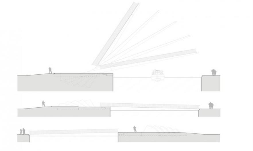 這是由Knight Architects建筑事務所設計的最新式的活動人行天橋,它位于倫敦帕丁頓的商人廣場的中心地帶,是在帕丁頓盆地開發(fā)過程中建造的一個綜合應用項目,并且已經(jīng)于這個月向公眾開放。項目是由橋梁專家 Knight Architects和結(jié)構(gòu)工程師AKT II在參加了2012設計大賽之后設計的。這是一個3米寬的懸臂結(jié)構(gòu),橫跨了20米寬的大聯(lián)盟運河,它是采用了液壓原理打開和升高橋梁,就好似日本傳統(tǒng)的扇子。因此這形成了一個動感雕塑剪影的效果,又很新奇,非常適合放在運河旁。