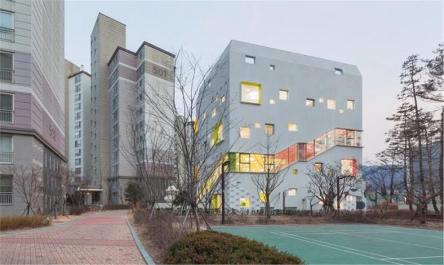 “鮮花+幼兒園”位于首爾的高密度社區(qū)里,它能夠為兒童提供一個動態(tài)的活動場所,同時利用其獨特的形狀,為當?shù)厣鐓^(qū)樹立起一個標桿建筑。