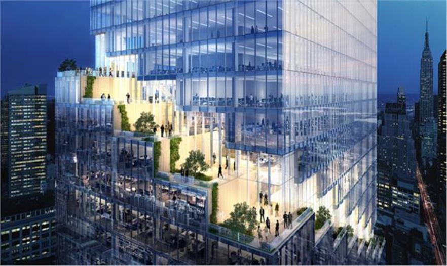 對(duì)室內(nèi)而言,每個(gè)露臺(tái)則變成了兩倍高的天井,它可以讓人欣賞曼哈頓的壯觀景色,同時(shí)也提供了一個(gè)非正式的空間用于會(huì)議、活動(dòng)和休閑活動(dòng)。而對(duì)于用于連接建筑不同樓層的空間給使用者除電梯之外提供了另一個(gè)選擇——鼓勵(lì)人們鍛煉身體與促進(jìn)人與人的互動(dòng)溝通。