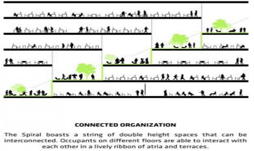 螺旋塔為現(xiàn)代辦公建筑設(shè)定了一個(gè)新的標(biāo)準(zhǔn),也就是讓自然成為工作環(huán)境的一個(gè)部分,而空間特點(diǎn)則是可以不斷地適應(yīng)使用者的需求產(chǎn)生變化。