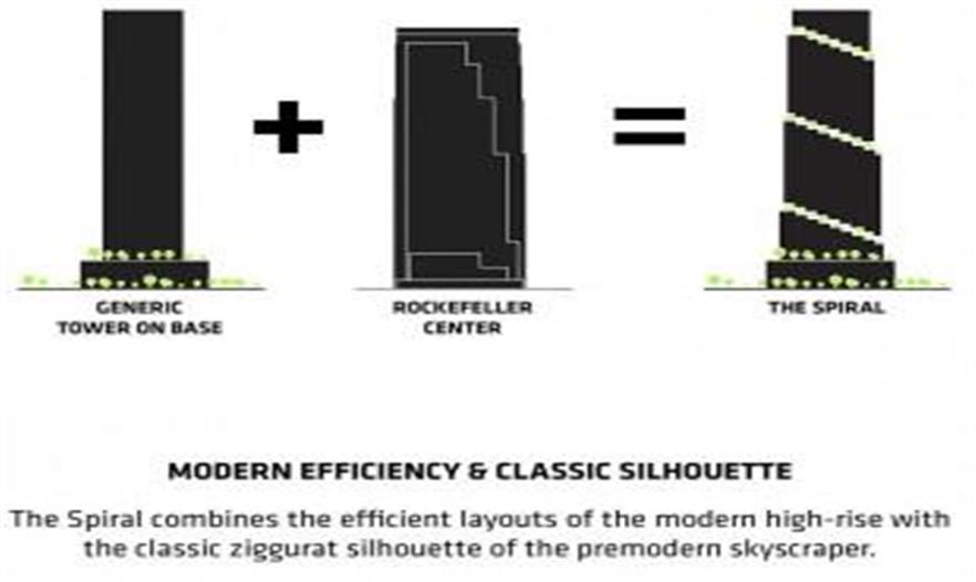 螺旋塔形式上一是對(duì)于紐約經(jīng)典階梯型摩天樓的回應(yīng),另外也是參考了Tishman Speyer的關(guān)于“自然進(jìn)化階梯”相關(guān)的作品集(Natural Evolutionary Step in the Tishman Speyer Portfolio)。
