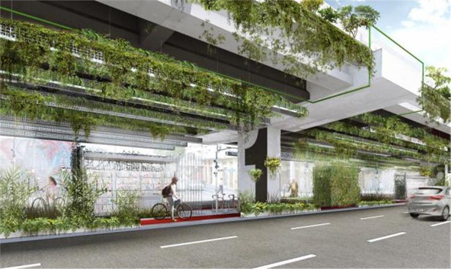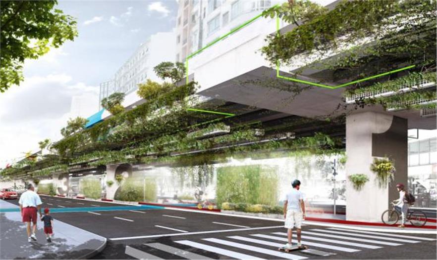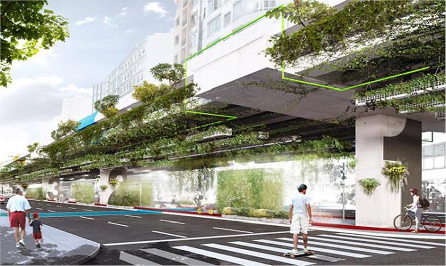 規(guī)劃非常簡(jiǎn)單,就是利用性強(qiáng)健,耐光性能好,低維護(hù)的熱帶植物品種優(yōu)化環(huán)境,降低二氧化碳污染。具體的措施是在高架橋的橋墩下,橋墩上,和路面?zhèn)炔亢拖虏慷疾贾弥参?,這些植物主要利用新設(shè)計(jì)的雨水收集系統(tǒng)收集的雨水而成活。除此之外景觀設(shè)計(jì)師還在人氣高的區(qū)域放置了綠色的服務(wù)亭,為市民提供文化,飲食,商店等各種功能的服務(wù)。