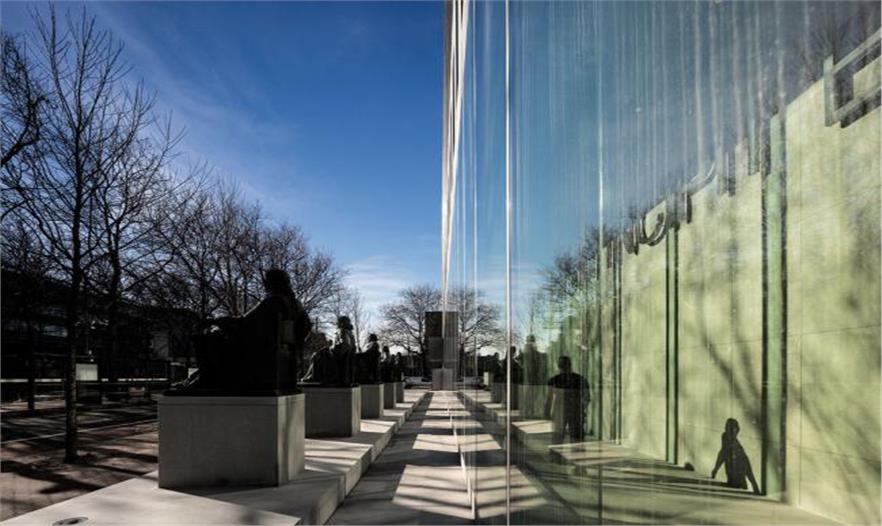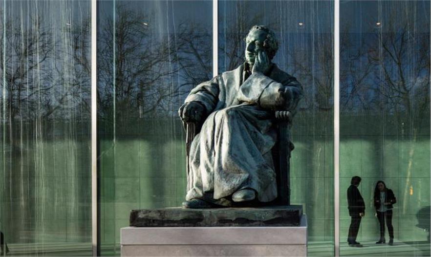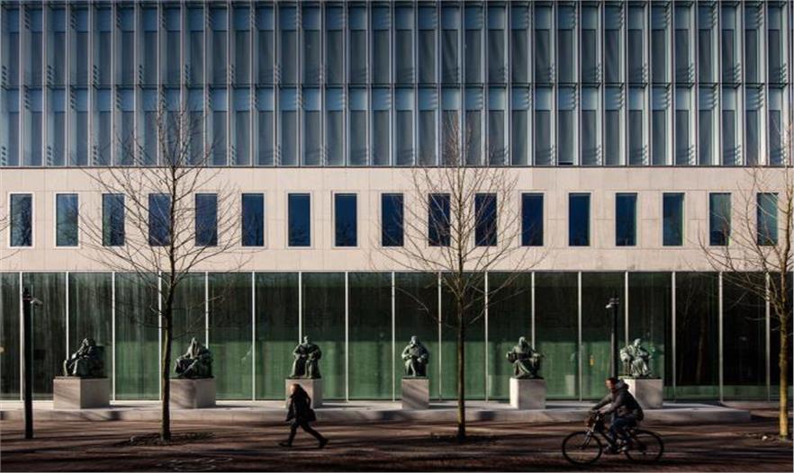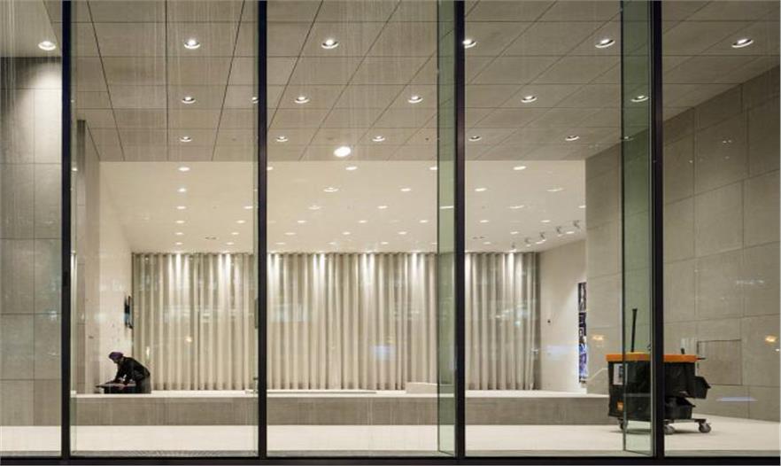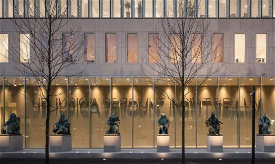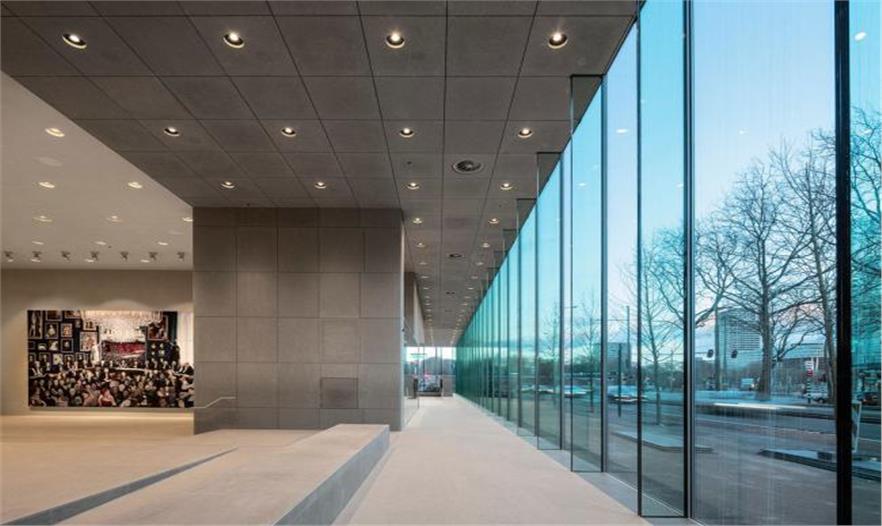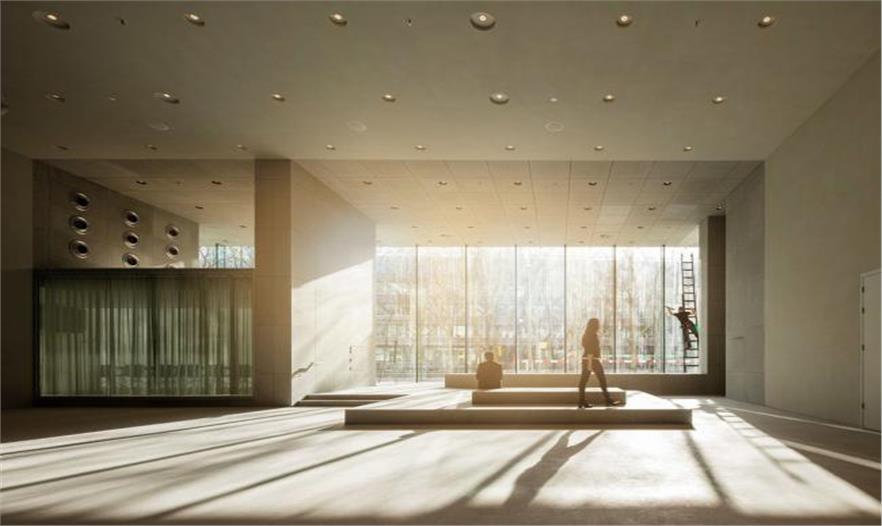 入口大廳作公共區(qū)域,承擔法庭和新聞發(fā)布室等功能,雙層高度的天花板橫跨在整個建筑的上方,開闊明亮,從地板到墻壁覆蓋以淺灰色的石灰石,質(zhì)地光滑,色彩柔和。一大一小兩個法庭用褐色半透明的雪花石膏墻分隔開來,分別可容納 400 人及 80 人。